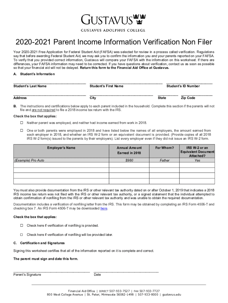 20202021 Parent Income Information Verification Non Filer Your 20202021 Free Application for Federal Student Aid (FAFSA) was selected for review in a process called verification. Regulations say that