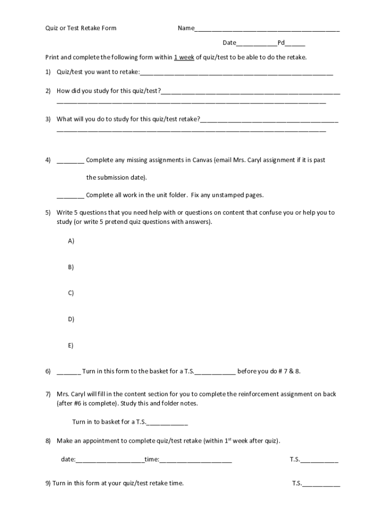 Quiz or Test Retake Forename___ Date___Pd___Print and complete the following form within 1 week of quiz/test to be able to do the retake. 1) Quiz/test you want to retake:___ 2) How did you study for