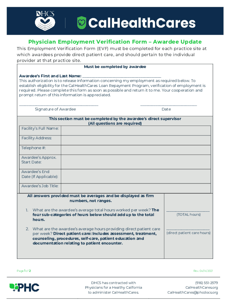 Get the free Physician Employment Verification Form Awardee Update