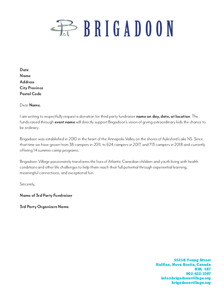 Date Name Address City Province Postal Code Dear Name, I am writing to respectfully request a donation for third party fundraiser name on day, date, at location. The funds raised through event name