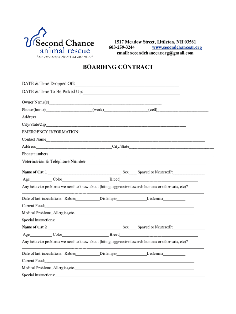 1517 Meadow Street, Littleton, NH 03561 6032593244 www.secondchancear.org email: secondchancear.org@gmail.comBOARDING CONTRACT DATE & Time Dropped Off:___ DATE & Time To Be Picked Up:___ Owner Name(s)___