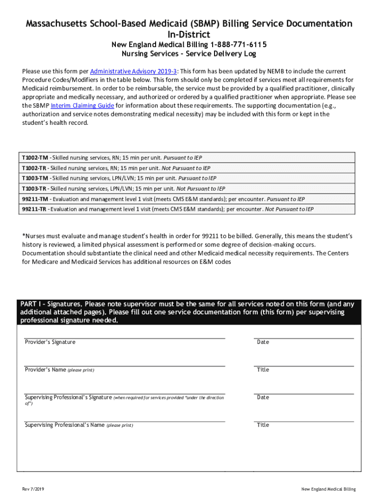 Massachusetts Schooled Medicaid (BMP) Billing Service Documentation District New England Medical Billing 18887716115 Nursing Services Service Delivery Log Please use this form per Administrative Advisory