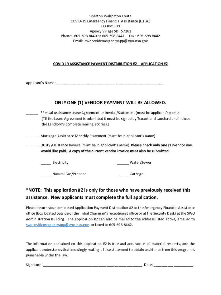 Mission Hampton Ovate COVID-19 Emergency Financial Assistance (E.F.A.) PO Box 509 Agency Village SD 57262 Phone: 6056988440 or 6056988441 Fax: 6056988442 Email: swocovidemergencyapp@swonsn.govCOVID