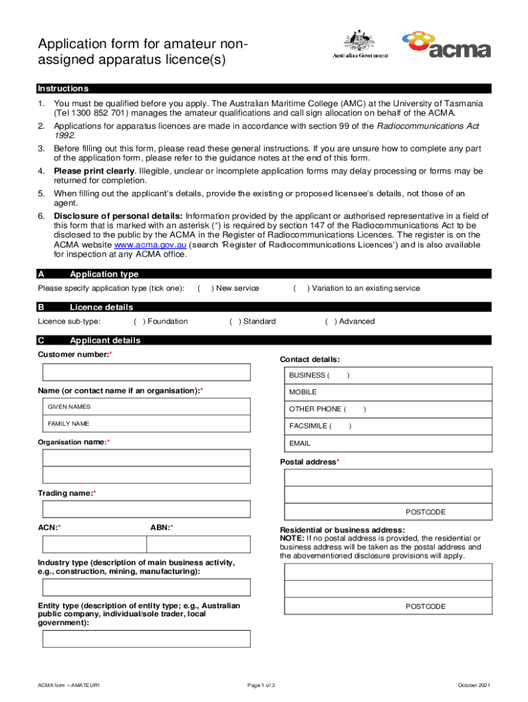 Application form for amateur nonassigned apparatus license(s) Instructions 1. You must be qualified before you apply. The Australian Maritime College (AMC) at the University of Tasmania (Tel 1300