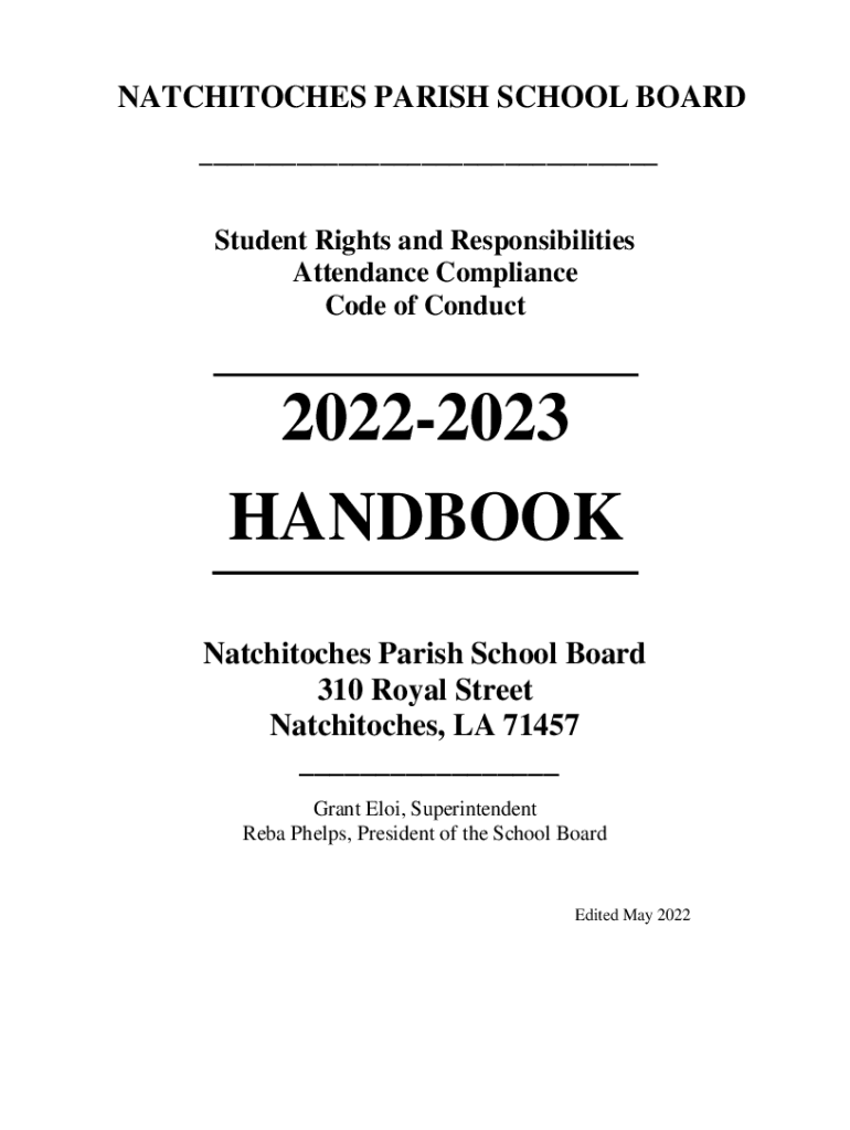 NATCHITOCHES PARISH SCHOOL BOARD ___ Student Rights and Responsibilities Attendance Compliance Code of Conduct20222023 HANDBOOK Natchitoches Parish School Board 310 Royal Street Natchitoches, LA 71457