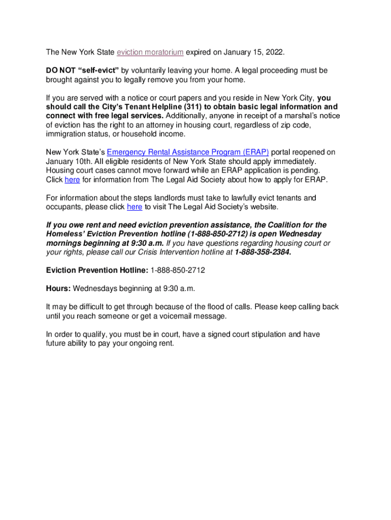 The New York State eviction moratorium expired on January 15, 2022. DO NOT self evict by voluntarily leaving your home. A legal proceeding must be brought against you to legally remove you from your