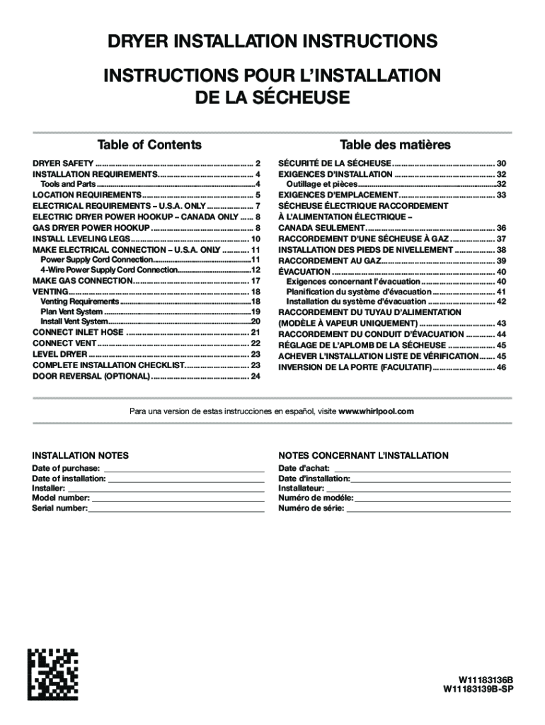 DRYER INSTALLATION INSTRUCTIONS POUR INSTALLATION DE LA SCHEME Table of Contents DRYER SAFETY........................................................................ 2 INSTALLATION REQUIREMENTS............................................