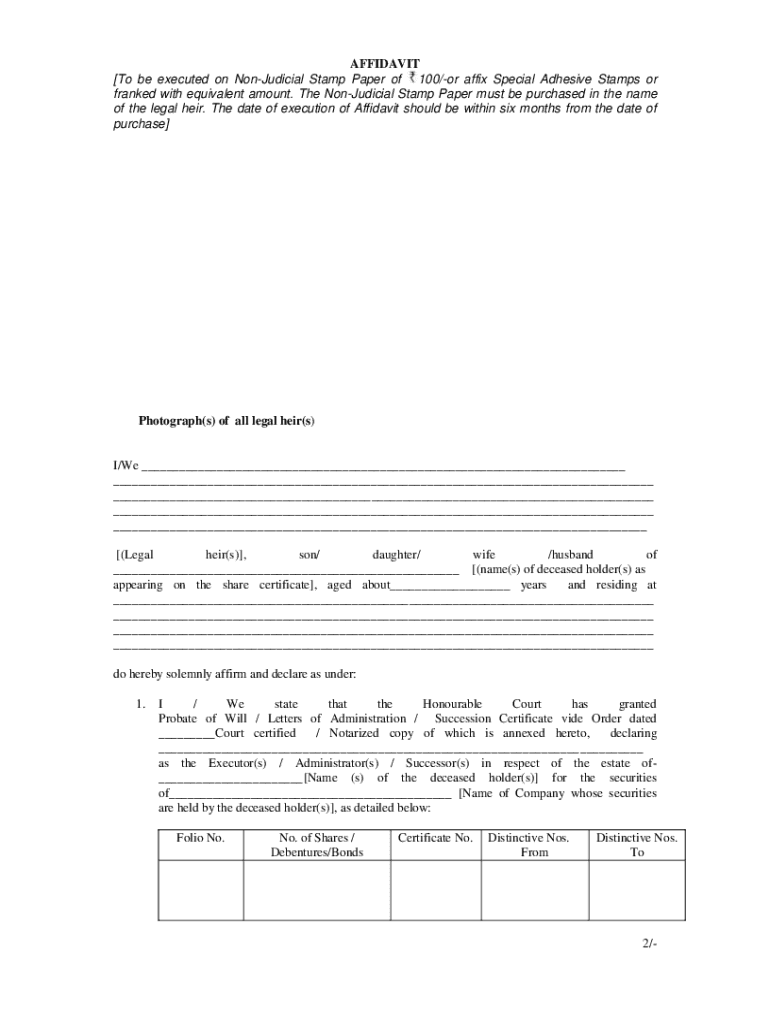 AFFIDAVIT [To be executed on Nonjudicial Stamp Paper of 100/or affix Special Adhesive Stamps or franked with equivalent amount. The Nonjudicial Stamp Paper must be purchased in the name of the legal