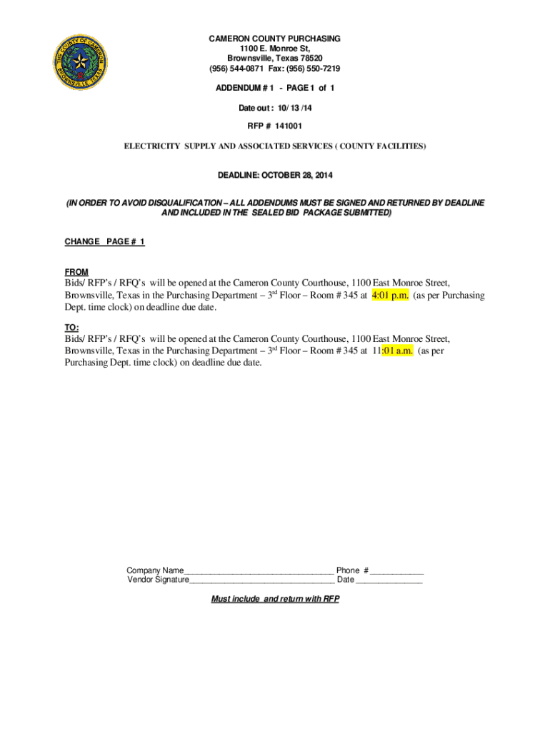 CAMERON COUNTY PURCHASING 1100 E. Monroe St, Brownsville, Texas 78520 (956) 5440871 Fax: (956) 5507219 ADDENDUM # 1 PAGE 1 of 1 Date out : 10/ 13 /14 RFP # 141001 ELECTRICITY SUPPLY AND ASSOCIATED