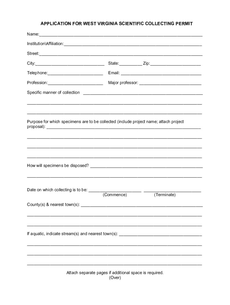 APPLICATION FOR WEST VIRGINIA SCIENTIFIC COLLECTING PERMIT Name:___ InstitutionAffiliation:___ Street:___ City:___ State:___ Zip:___ Telephone:___Email: ___Profession:___Major professor: ___Specific