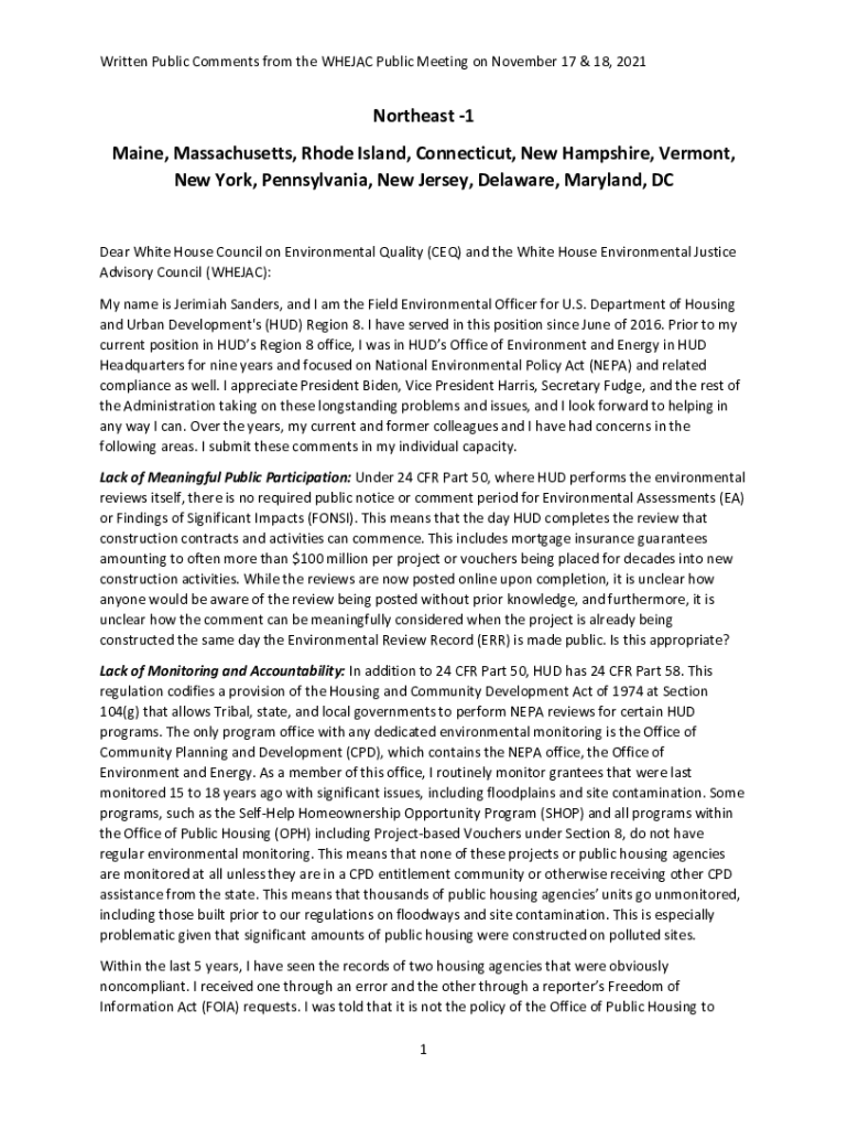 Written Public Comments from the WHEAT Public Meeting on November 17 & 18, 2021Northeast 1 Maine, Massachusetts, Rhode Island, Connecticut, New Hampshire, Vermont, New York, Pennsylvania, New Jersey,