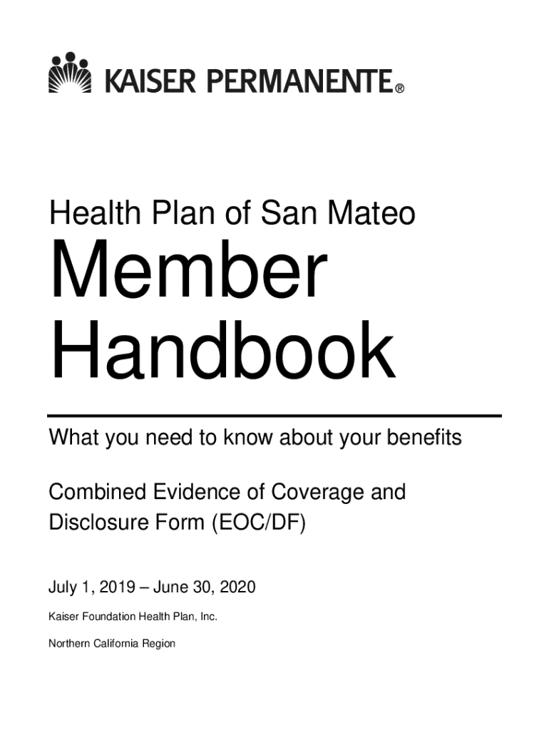 Health Plan of San MateoMember Handbook What you need to know about your benefits Combined Evidence of Coverage and Disclosure Form (EOC/OF) July 1, 2019, June 30, 2020, Kaiser Foundation Health Plan,