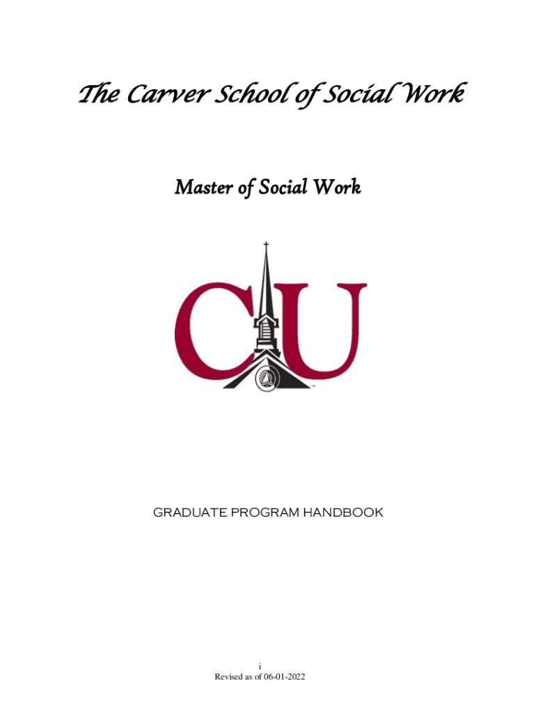 The Carver School of Social Work Master of Social Postgraduate PROGRAM Handbook Revised as of 06012022Contents GRADUATE PROGRAM HANDBOOK ............................................................................................