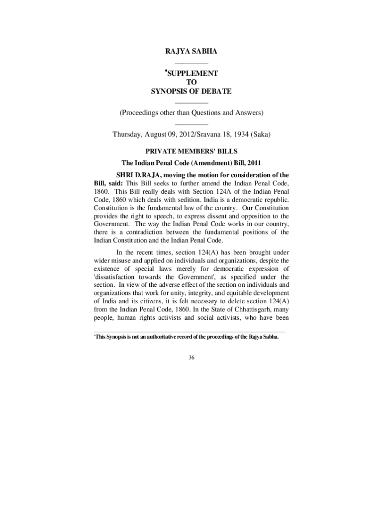 RAJA SASHA ___ SUPPLEMENT TO SYNOPSIS OF DEBATE ___ (Proceedings other than Questions and Answers) ___ Thursday, August 09, 2012/Havana 18, 1934 (Aka) PRIVATE MEMBERS\' BILLS The Indian Penal Code