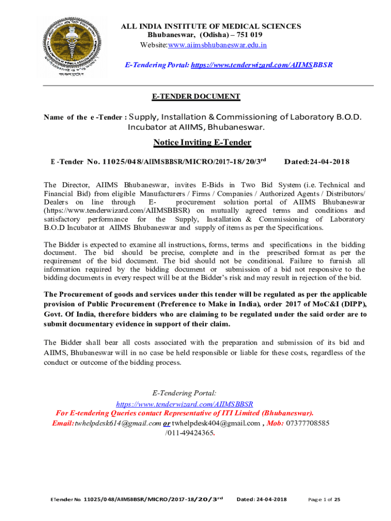 ALL INDIA INSTITUTE OF MEDICAL SCIENCES Bhubaneswar, (Odisha) 751 019 Website:www.aiimsbhubaneswar.edu.in Tendering Portal: https://www.tenderwizard.com/AIIMSBBSRETENDER DOCUMENT Name of the e Tender