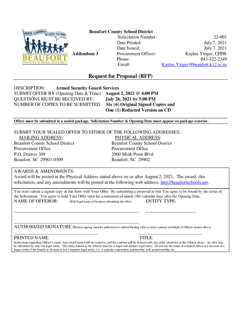 Beaufort County School District Solicitation Number: Date Printed: Date Issued: Addendum 3 Procurement Officer: Phone: Email:22001 July 7, 2021, July 7, 2021, Kaylee Singer, PPB 8433222349 Kaylee.Yinger@beaufort.k12.sc.usRequest
