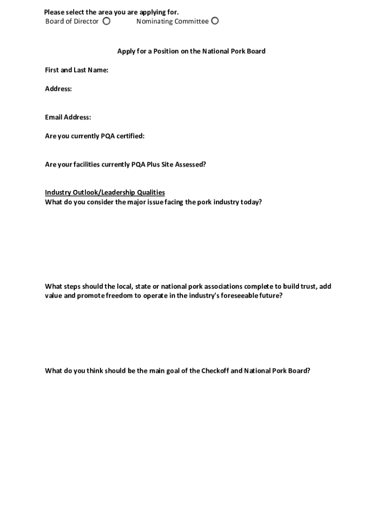 Please select the area you are applying for. Board of Director Nominating CommitteeApply for a Position on the National Pork Board First and Last Name: Address: Email Address: Are you currently PA
