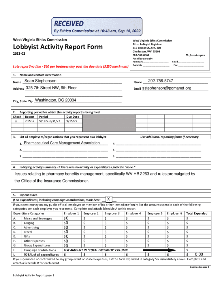 By Ethics Commission at 10:48 am, Sep 14, 2022West Virginia Ethics Commission West Virginia Ethics Commission Attn: Lobbyist Registrar 210 Brooks St., Ste. 300 Charleston, WV 25301 3045580664Lobbyist