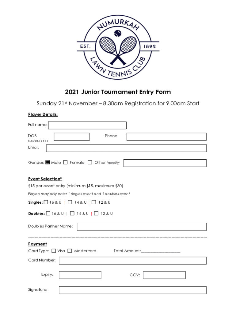 2021 Junior Tournament Entry Form Sunday 21st November 8.30am Registration for 9.00am Start Player Details: Full name: DOBPhoneMM/DD/YYYYEmail:Gender:MaleFemaleOther (specify)Event Selection* $15