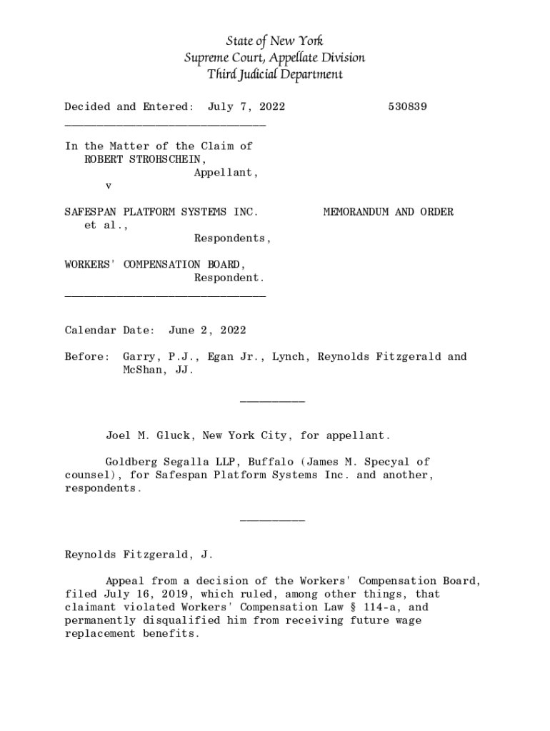 State of New York Supreme Court, Appellate Division Third Judicial Department Decided and Entered: July 7, 2022 ___530839In the Matter of the Claim of ROBERT STROHSCHEIN, Appellant, v SAFE SPAN PLATFORM
