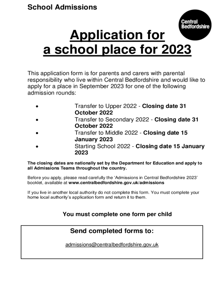 School AdmissionsApplication for a school place for 2023 This application form is for parents and carers with parental responsibility who live within Central Bedfordshire and would like to apply for