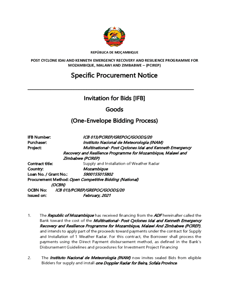 REPLICA DE MOAMBIQUEPOST CYCLONE DAI AND KENNETH EMERGENCY RECOVERY AND RESILIENCE Program FOR MOZAMBIQUE, MALAWI AND ZIMBABWE (PCI REP)Specific Procurement Notice ___ Invitation for Bids [IF] Goods