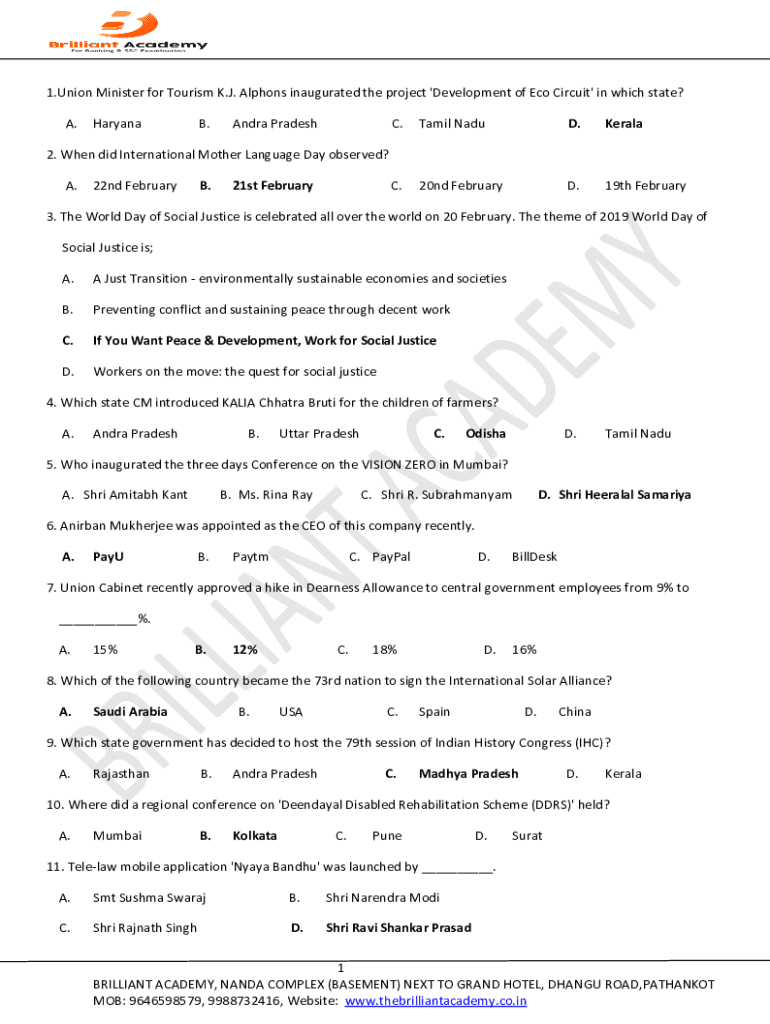 1. Union Minister for Tourism K.J. Alfons inaugurated the project \'Development of Eco Circuit\' in which state? A. Haryana. Andrei Pradesh. Tamil Named. Kerala.20th February.19th February2. When