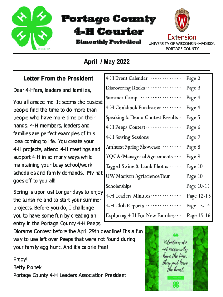 Portage County 4H Courier Bimonthly Periodical April / May 2022 Letter From the President Dear 4H\'ERS, leaders and families, You all amaze me! It seems the busiest people find the time to do more