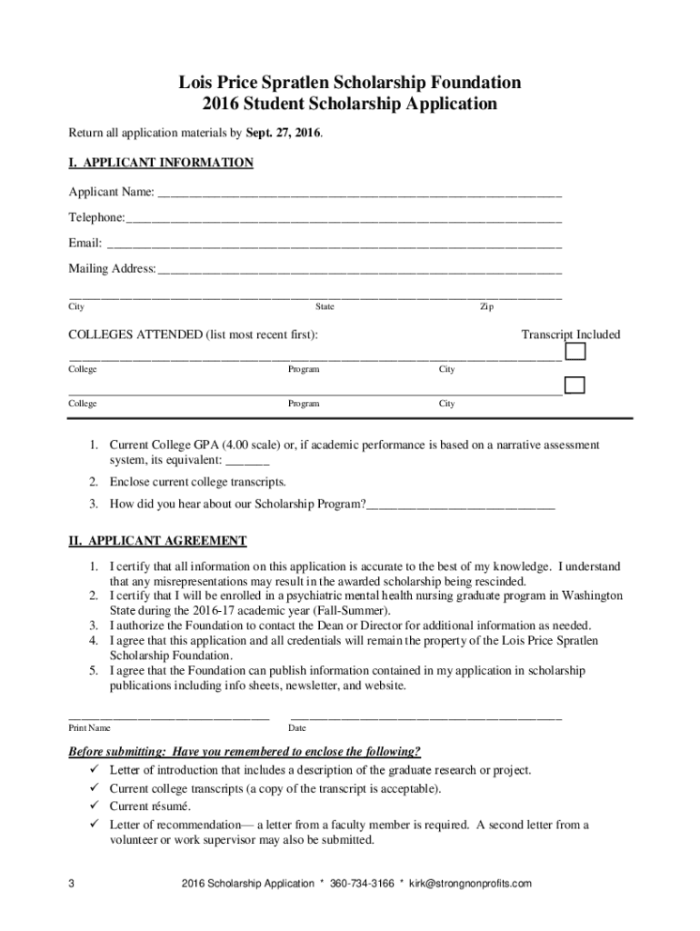 Lois Price Sprawled Scholarship Foundation 2016 Student Scholarship Application Dear Student, The Lois Price Sprawled Scholarship Foundation invites graduate students in psychiatric mental health