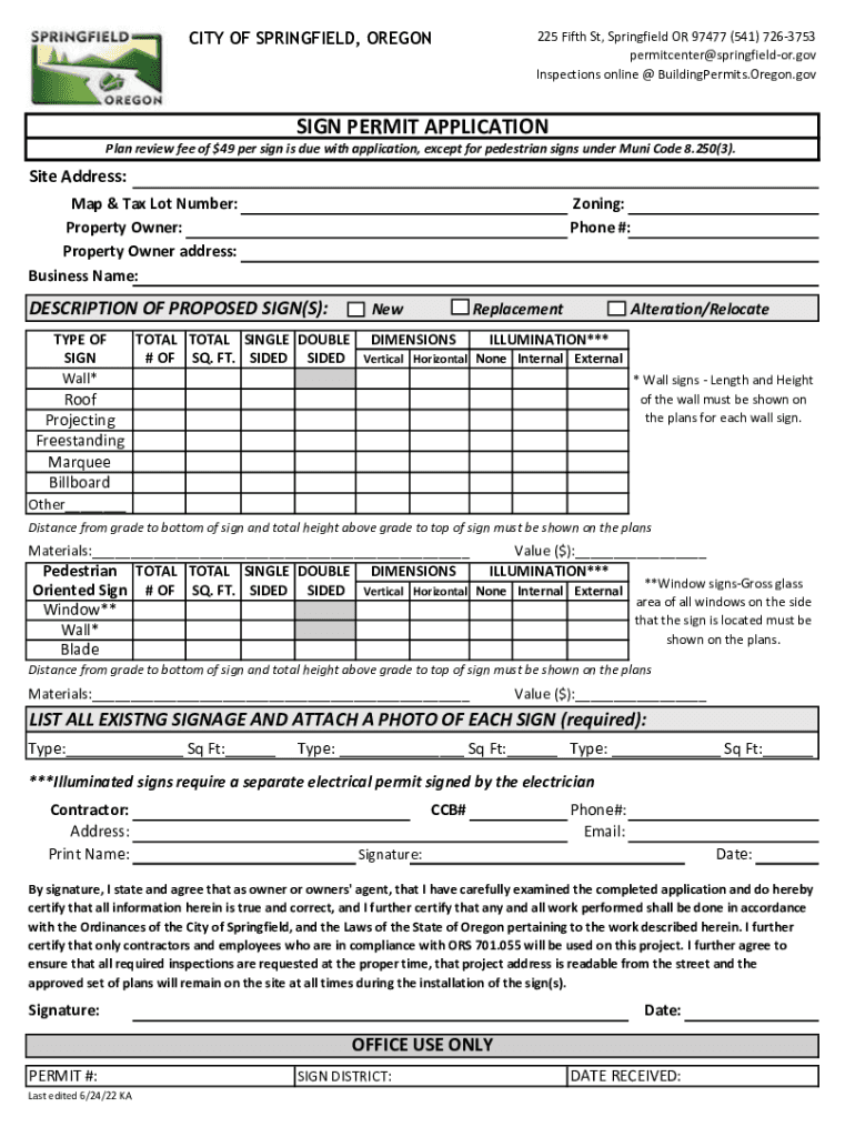 CITY OF SPRINGFIELD, OREGON225 Fifth St, Springfield OR 97477 (541) 7263753 permitcenter@springfieldor.gov Inspections online @ BuildingPermits. Oregon.consign PERMIT APPLICATION Plan review fee of