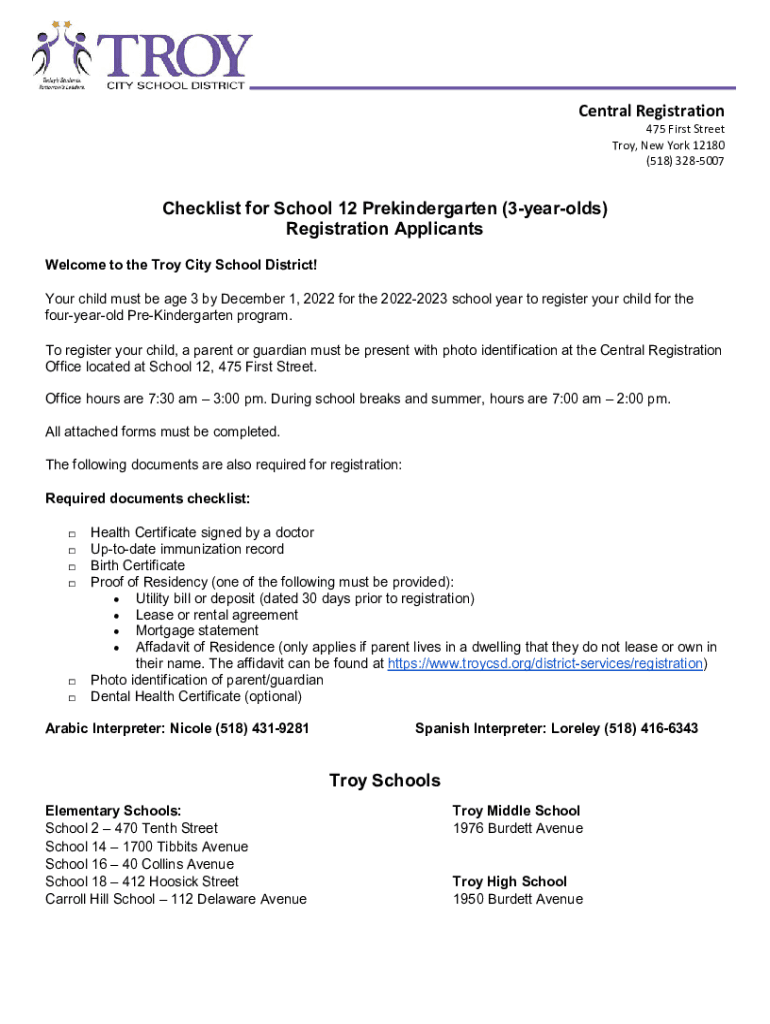 Central Registration 475 First Street Troy, New York 12180 (518) 3285007Checklist for School 12 Prekindergarten (3yearolds) Registration Applicants Welcome to the Troy City School District! Your child