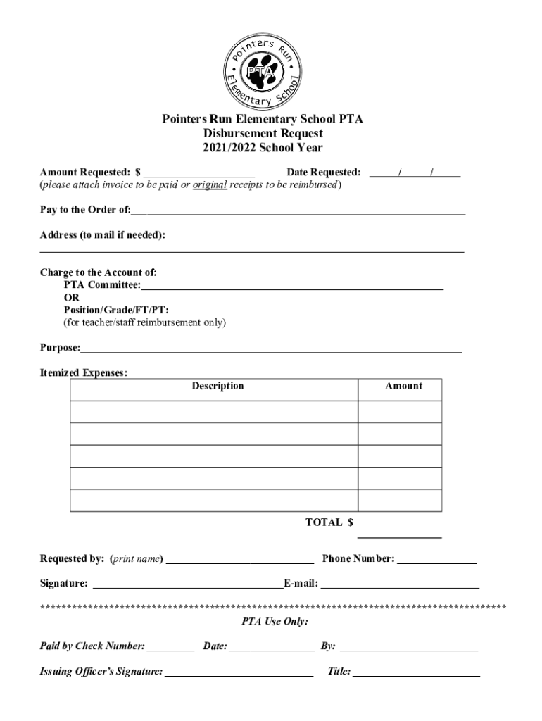 Pointers Run Elementary School PTA Disbursement Request 2021/2022 School Year Amount Requested: $ ___ Date Requested: (please attach invoice to be paid or original receipts to be reimbursed)//___Pay