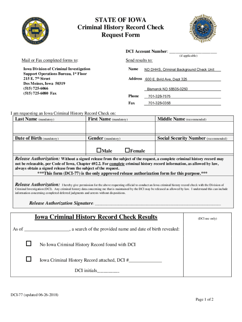 STATE OF IOWA Criminal History Record Check Request Form DCI Account Number: ___ (if applicable)Mail or Fax completed forms to:Send results to:Iowa Division of Criminal Investigation Support Operations