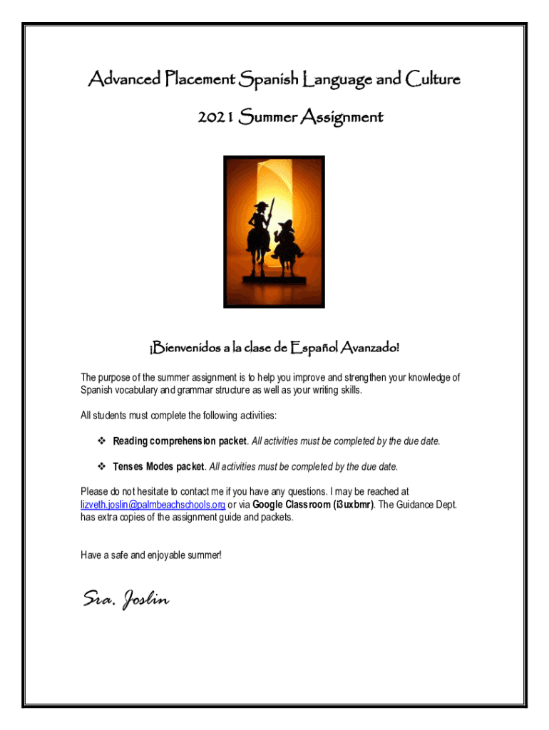 Advanced Placement Spanish Language and Culture 2021 Summer AssignmentBienvenidos à lac lase de Español Alvarado! The purpose of the summer assignment is to help you improve and strengthen your