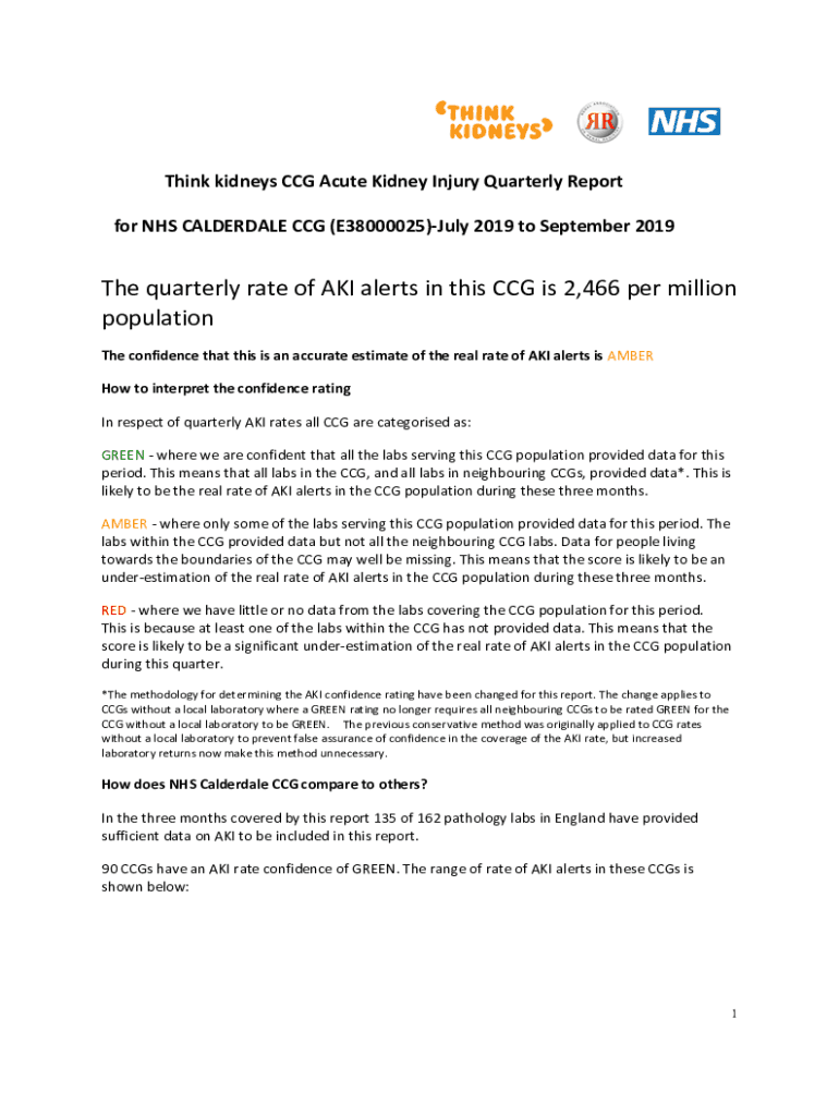 Think kidneys CCG Acute Kidney Injury Quarterly Report for NHS ALLERDALE CCG (E38000025)July 2019 to September 2019The quarterly rate of AKA alerts in this CCG is 2,466 per million population The