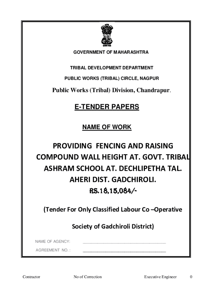 GOVERNMENT OF MAHARASHTRATRIBAL DEVELOPMENT DEPARTMENT PUBLIC WORKS (TRIBAL) CIRCLE, NAGPURPublic Works (Tribal) Division, Chandra. TENDER PAPERS NAME OF WORKPROVIDING FENCING AND RAISING COMPOUND