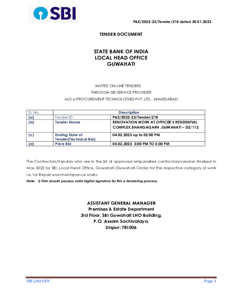 P&E/202223/Tender/218 dated 30.01.2023TENDER DOCUMENTSTATE BANK OF INDIA LOCAL HEAD OFFICE GUWAHATIINVITES ONLINE TENDERS THROUGH SBI SERVICE PROVIDER M/Se PROCUREMENT TECHNOLOGIES PVT. LTD., Ahmedabad.