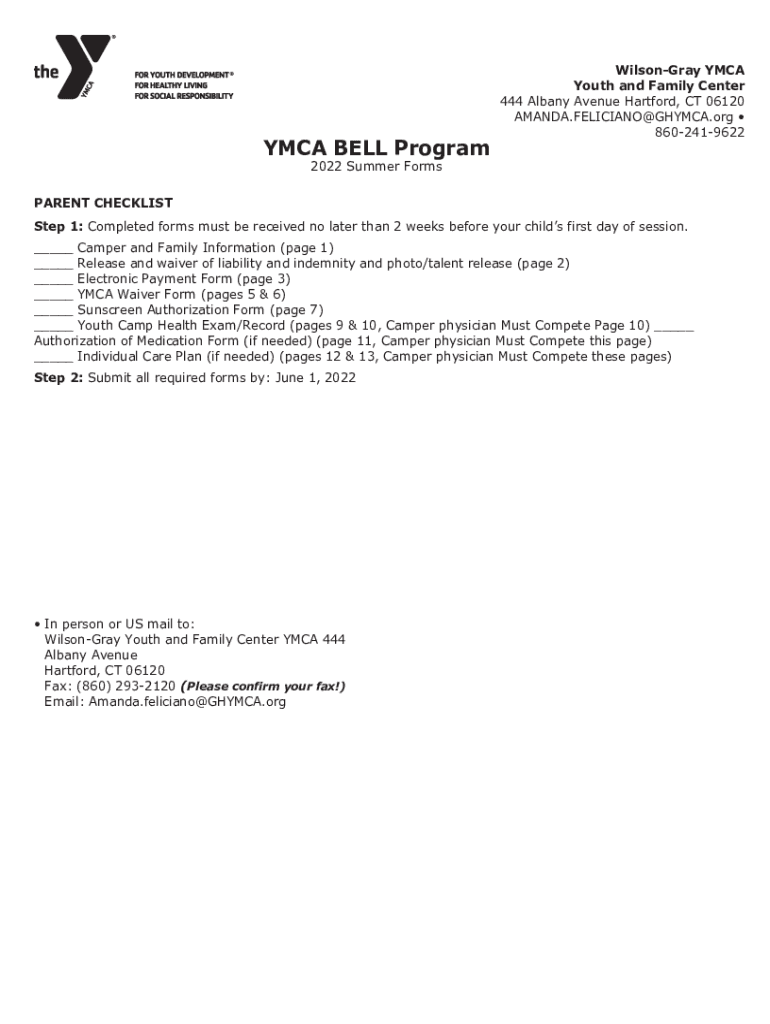 YMCA BELL ProgramWilsonGray YMCA Youth and Family Center 444 Albany Avenue Hartford, CT 06120 AMANDA.FELICIANO@GHYMCA.org 86024196222022 Summer FormsPARENT CHECKLIST Step 1: Completed forms must be