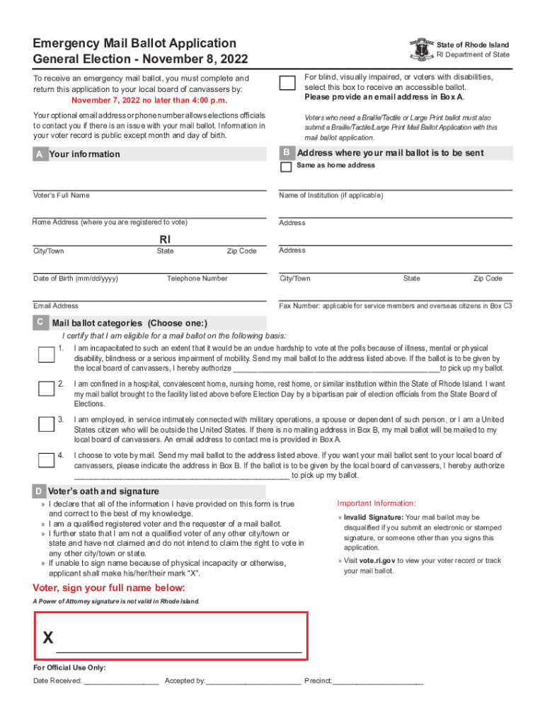 Emergency Mail Ballot Application General Election November 8, 2022State of Rhode Island RI Department of State receive an emergency mail ballot, you must complete and return this application to your