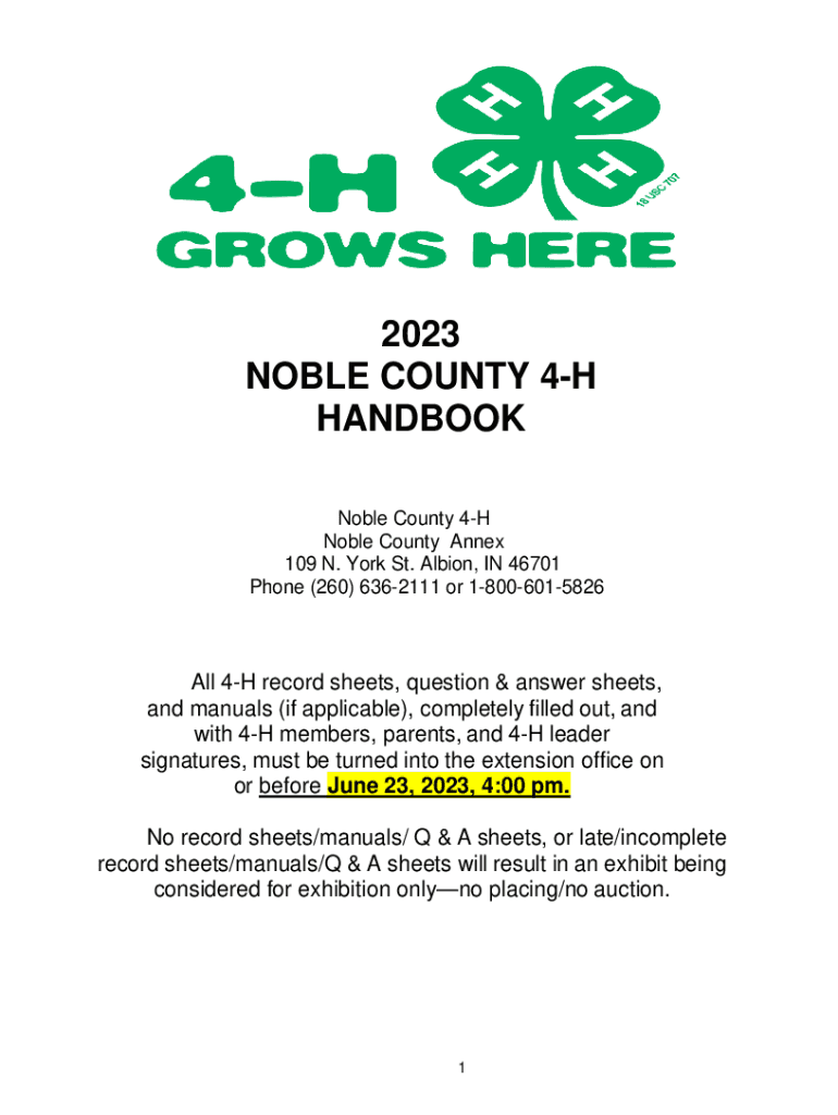 2023 NOBLE COUNTY 4H HANDBOOK Noble County 4H Noble County Annex 109 N. York St. Albion, IN 46701 Phone (260) 6362111 or 18006015826All 4H record sheets, question & answer sheets, and manuals (if