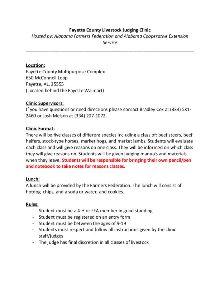 FayetteCountyLivestockJudgingClinic Hosted by:AlabamaFarmersFederationandAlabamaCooperativeExtension Service ___ Location: FayetteCountyMultipurposeComplex 650McConnellLoop Fayette, AL.35555 (LocatedbehindtheFayetteWalmart)