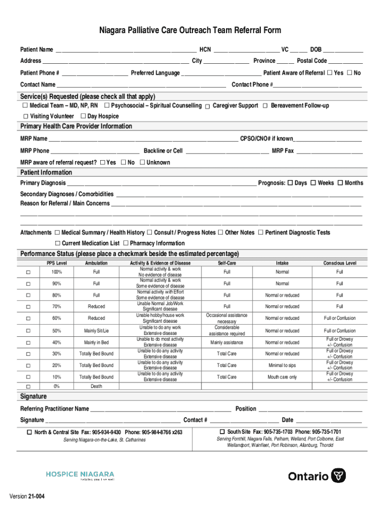 Niagara Palliative Care Outreach Team Referral Form Patient Name ___ HAN ___ VC ___ DOB ___ Address ___ City ___ Province ___ Postal Code ___ Patient Phone # ___ Preferred Language ___ Patient Aware