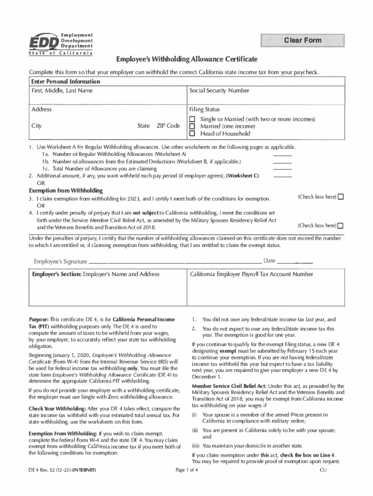 .,,,,,,,,,,.... Employment Development Department _, .__, c: State of CaliforniaEDDClear FormEmployee\'s Withholding Allowance CertificateComplete this form so that your employer can withhold the