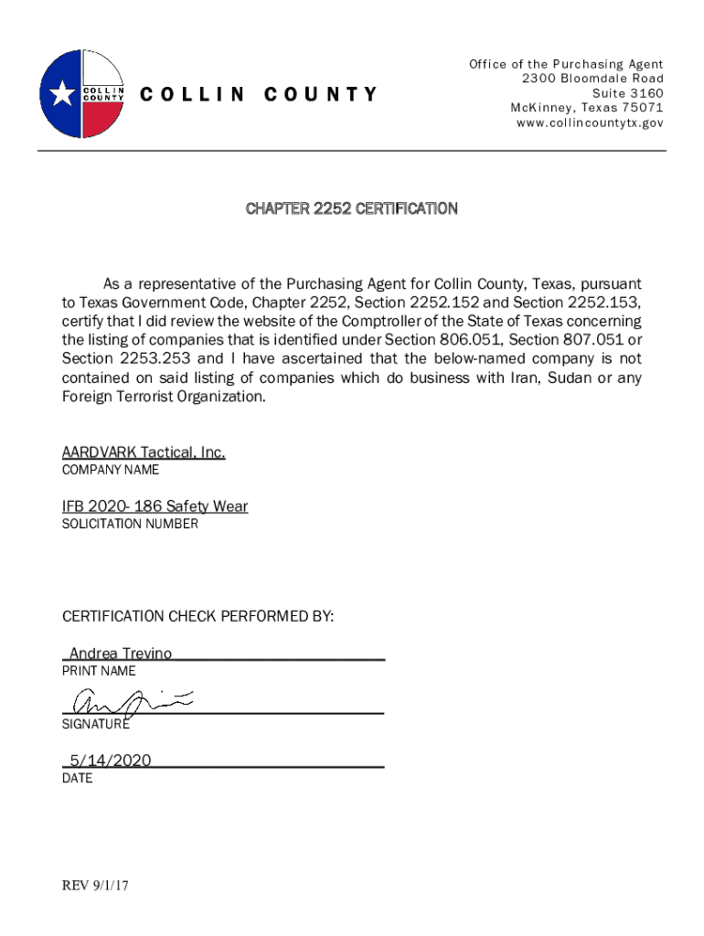 COLLIN COUNTY Office of the Purchasing Agent 2300 Bloom dale Road Suite 3160 McKinney, Texas 75071 www.collincountytx.govCHAPTER 2252 Certifications a representative of the Purchasing Agent for Collin