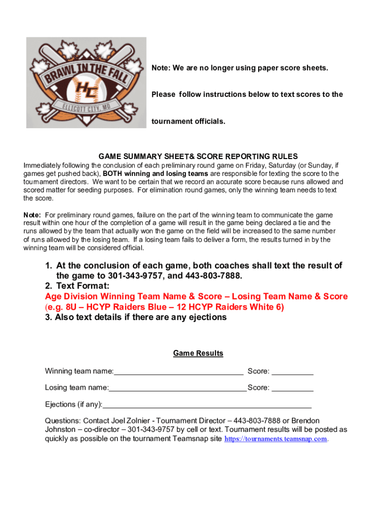 Note: We are no longer using paper scoresheets. Please follow instructions below to text scores to the tournament officials. GAME SUMMARY SHEET SCORE REPORTING RULES Immediately following the conclusion