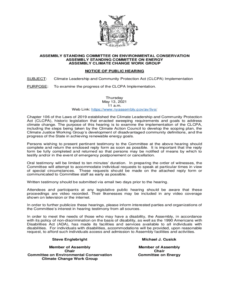 ASSEMBLY STANDING COMMITTEE ON ENVIRONMENTAL CONSERVATION ASSEMBLY STANDING COMMITTEE ON ENERGY ASSEMBLY CLIMATE CHANGE WORK GROUP NOTICE OF PUBLIC HEARING SUBJECT:Climate Leadership and Community