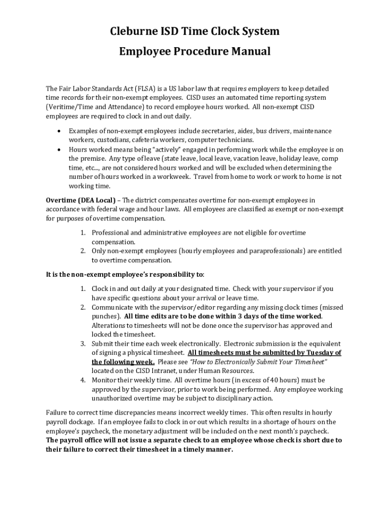 Cliburn ISD Time Clock System Employee Procedure Manual The Fair Labor Standards Act (FLEA) is a US labor law that requires employers to keep detailed time records for their nonexempt employees. CSD