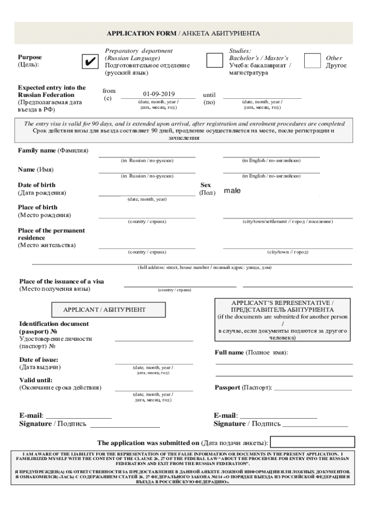 APPLICATION FORM / Purpose ():Preparatory department (Russian Language) ()Expected entry into the Russian Federation ()from ()01092019 (date, month, year /,)Studies: Bachelors / Masters : / until