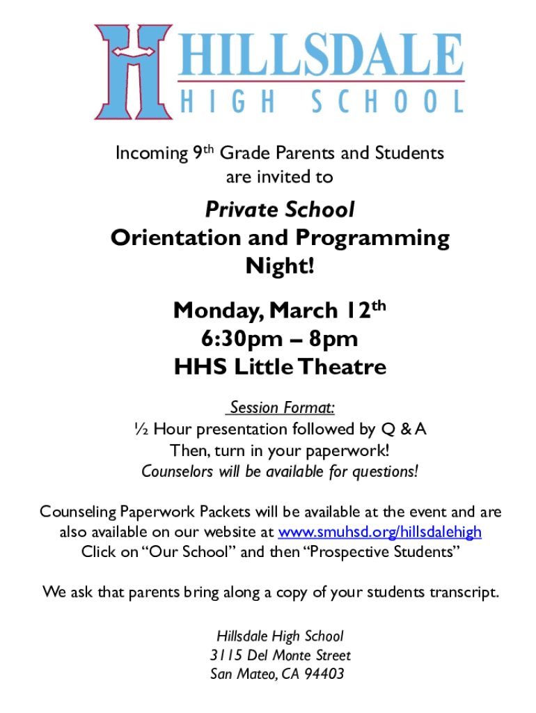 Incoming 9th Grade Parents and Students are invited to Private School Orientation and Programming Night! Monday, March 12th 6:30pm 8pm HHS Little Theater Session Format: Hour presentation followed