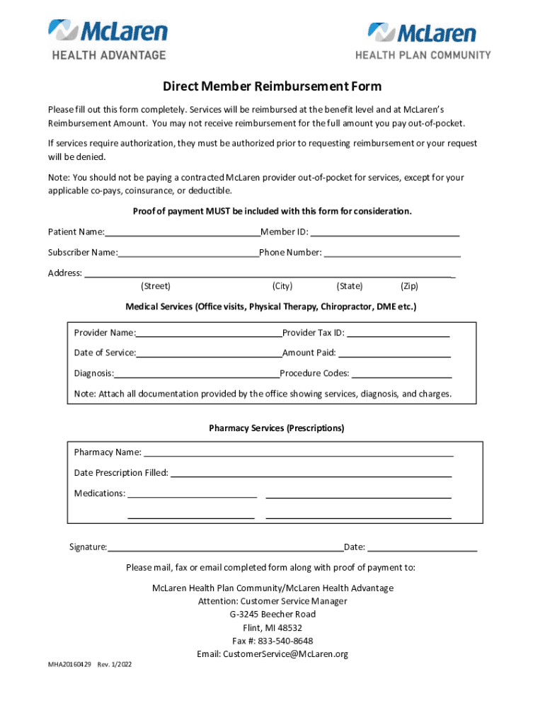 Direct Member Reimbursement Form Please fill out this form completely. Services will be reimbursed at the benefit level and at Cleans Reimbursement Amount. You may not receive reimbursement for the
